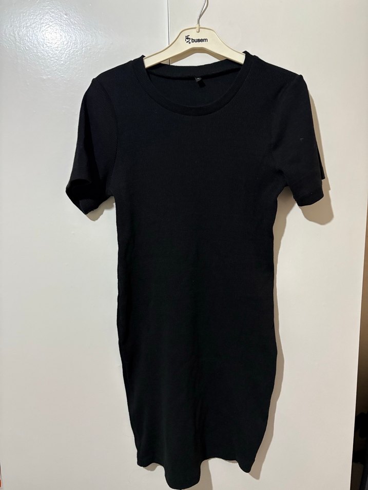 Siyah midi uzunluğunda, kısa kollu ve bisiklet yakalı, vücuda oturan basic kadın elbise. Günlük kullanıma uygundur.