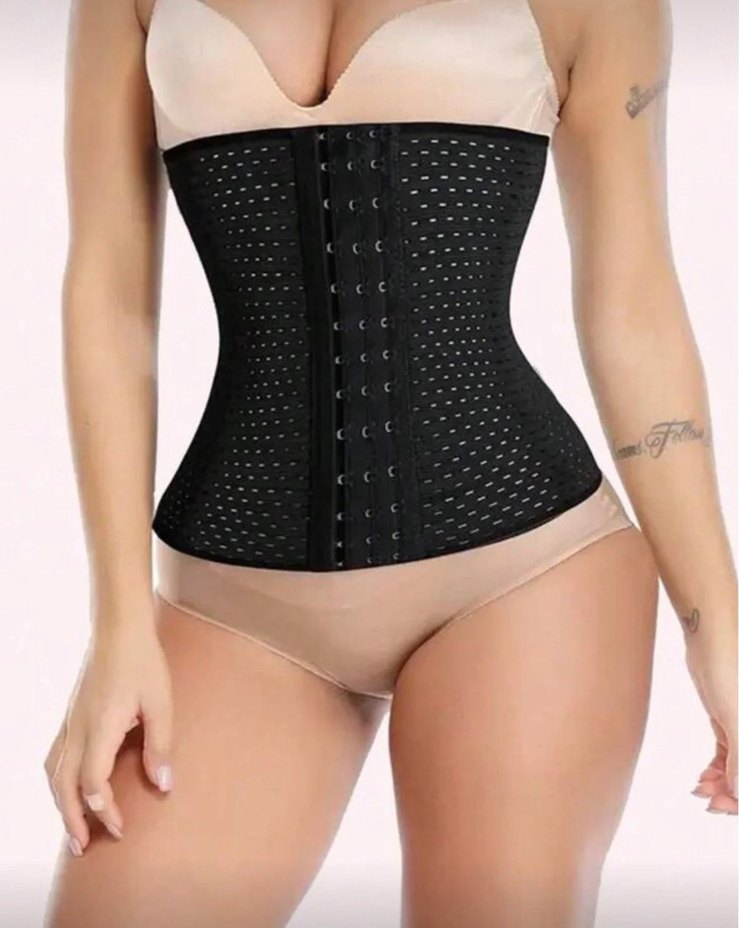 Siyah renkli, normal uzunlukta, nefes alabilen delikli kumaş ve ön kanca kapamalı, vücuda oturan midi bel korsesi.