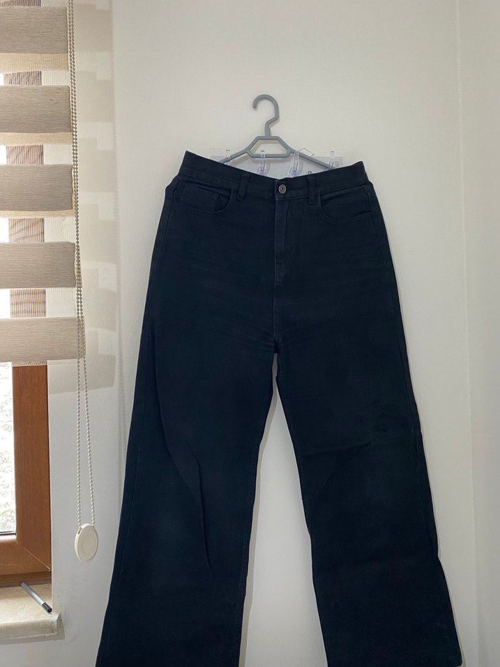Siyah kot pantolon, bol kesim ve midi boy uzunluğa sahip. Minimalist ve rahat şıklık sunar, günlük kullanım için uygundur.