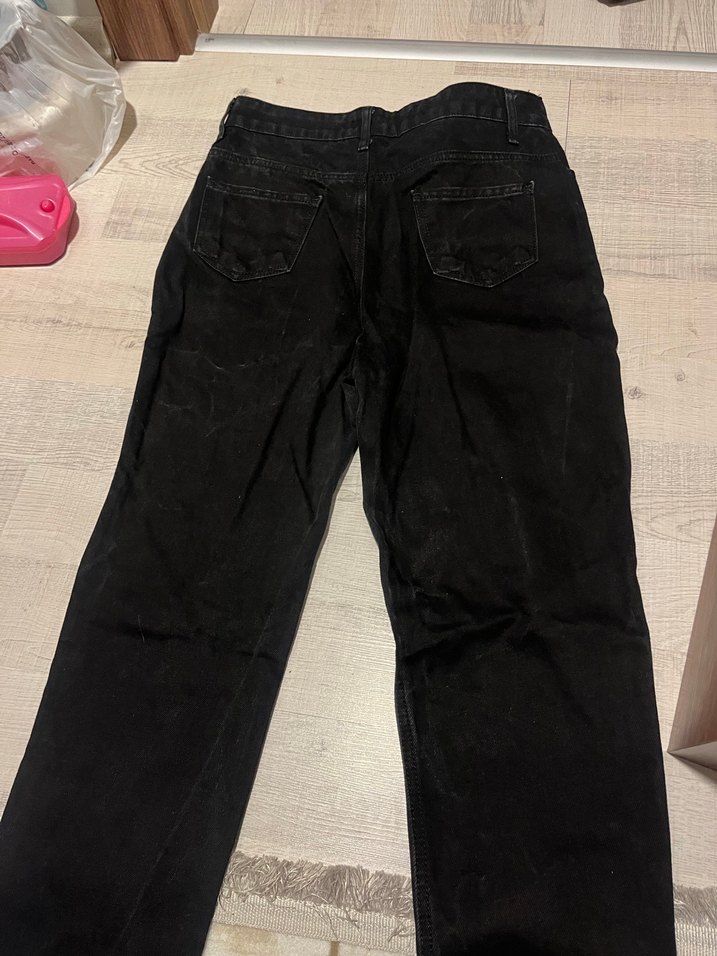 Siyah midi boy, bol kesim kadın kot pantolon. Denim kumaştan, günlük ve sokak stili için rahat ve şık bir seçenek.