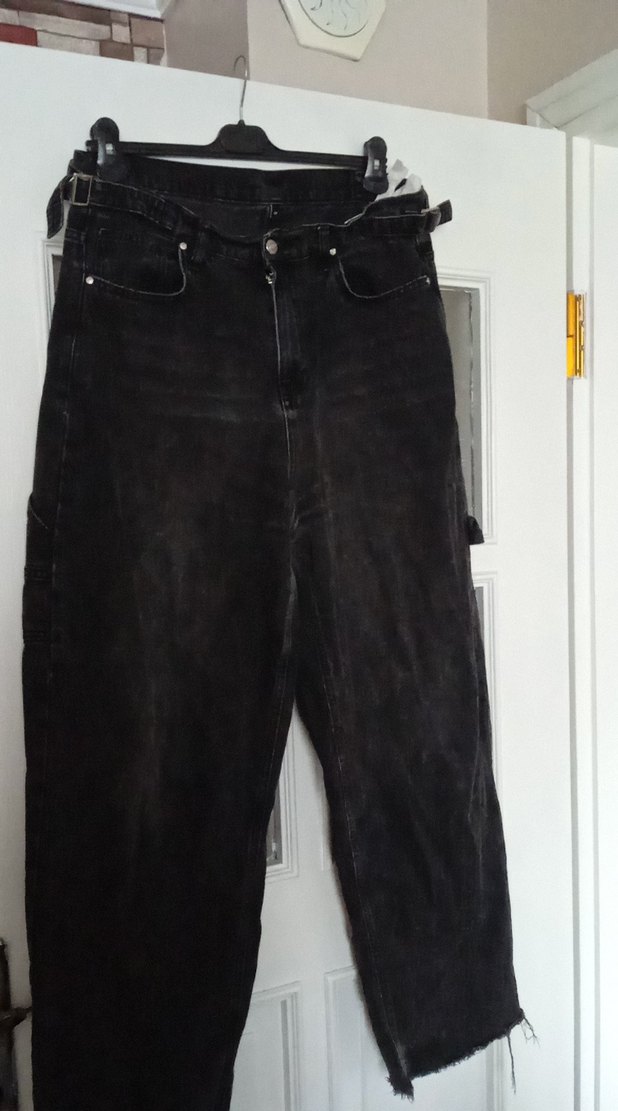 Siyah renkte, midi boy, bol kesim ve kemerli kot pantolon. Günlük kullanım için uygun, desen içermeyen rahat bir tasarım.