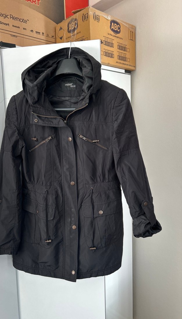 Siyah midi boy, düğmeli kadın ceket. Yağmurluk tarzı, oturtmalı beldenkesim ve kapşon sabit detaylı. Sokak stili ve açık hava kullanımı için uygun. Strappy kollu. Kollar katlanıyor çıt çıtlı baharlık gibi