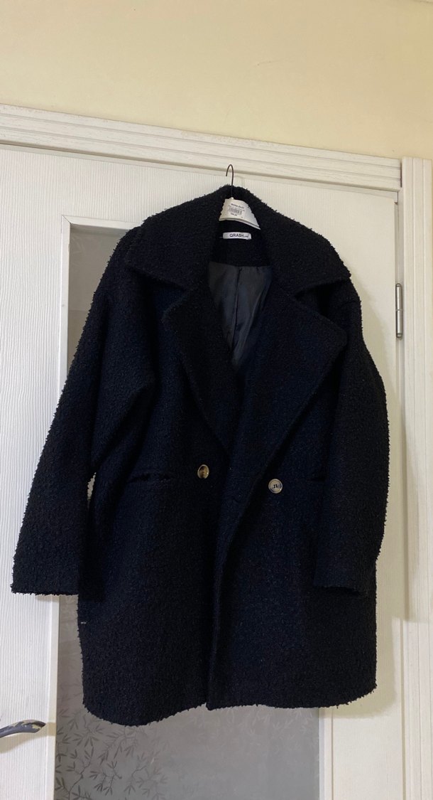 Siyah midi boy, düğmeli kadın kaban, geniş kesim, uzun kollu ve yumuşak dokulu, rahat günlük kullanıma uygundur.