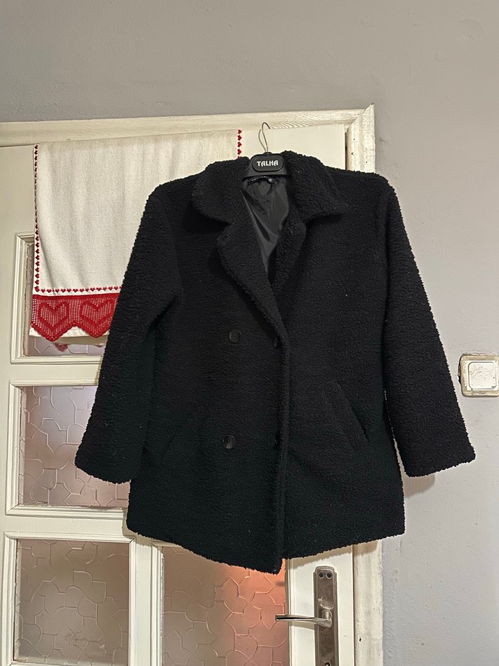 Siyah midi boy, düğmeli kadın kaban. Uzun kollu, regular fit ve yumuşak, sıcak kumaştan üretilmiştir. Rahat sokak stili için uygundur.