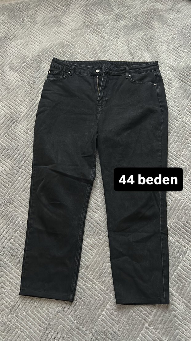 Düğmeli, siyah midi boy kadın kot pantolon. Normal kesim ve günlük sokak stili için uygundur. 44 beden.