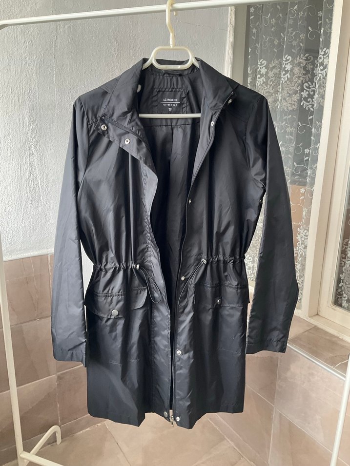 Siyah renk, düğmeli ve normal kesim kadın yağmurluğun midi boyu, notched lapel yaka ve uzun kolludur. Günlük kullanıma uygundur ve sentetik kumaştan üretilmiştir. ️