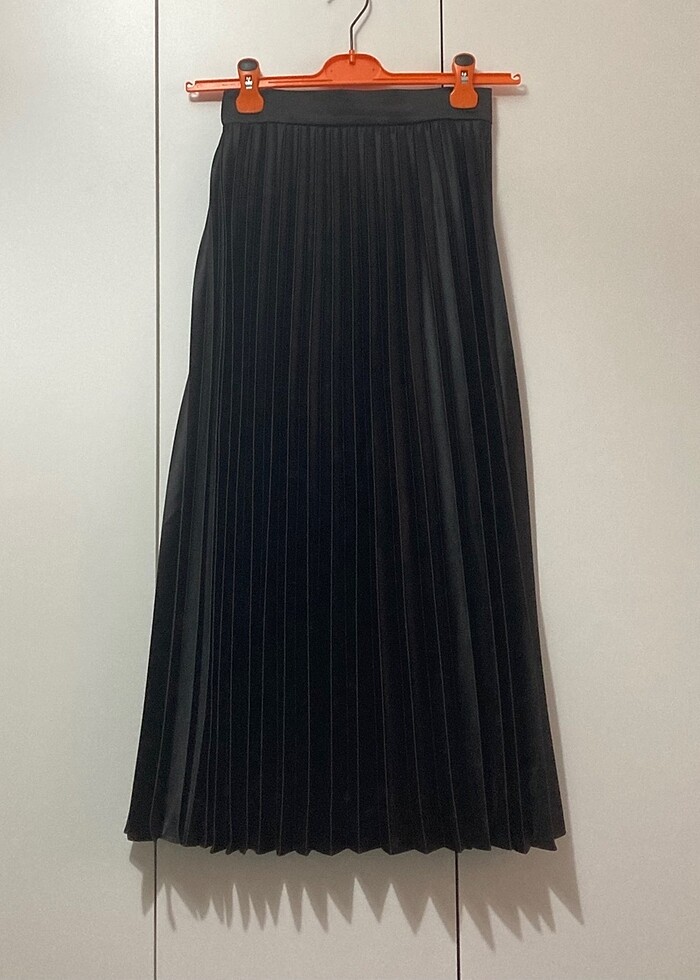 Ürün 1 kere giyildi. Ön kemeri düz, arka tarafı 3. fotoğrafta göründüğü gibi lastikli. Yan tarafta fermuarı var. Kemer kısmından etek ucuna uzunluğu 82 cm. Astarı yok ama kumaşı iç göstermeyen kumaş.