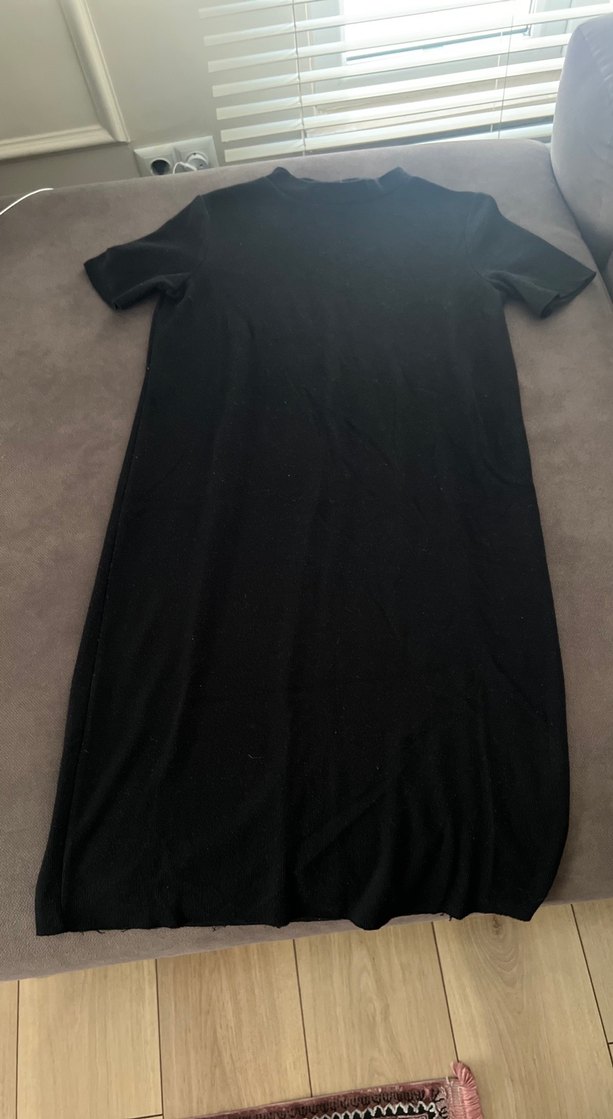 Siyah midi boy, kısa kollu, dik yaka tasarıma sahip, yumuşak pamuklu kumaştan üretilmiş dar kesim elbise.