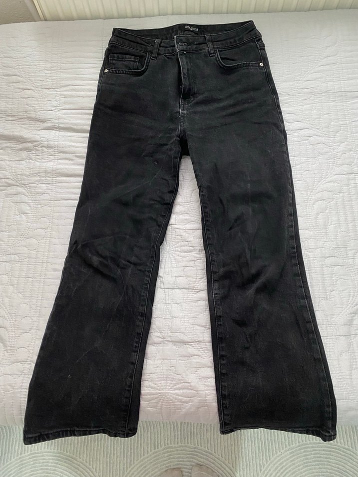 Siyah midi boy, geniş kesim denim kot pantolon, minimalist ve sokak stiliyle günlük kullanıma uygun rahat şıklık sunar.