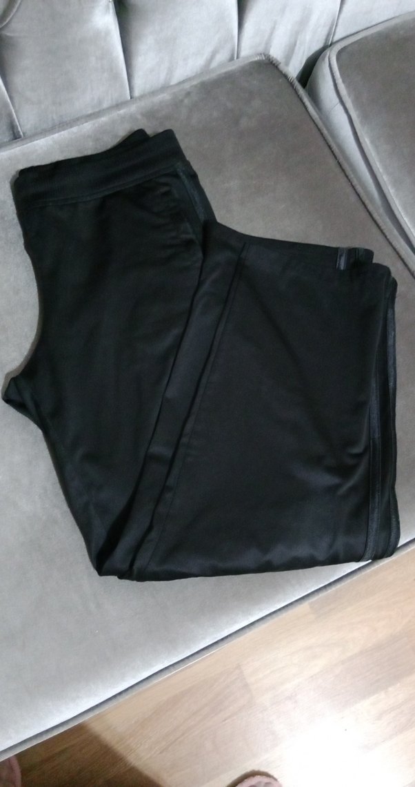 Siyah renkli, ince kesim ve midi boyda, pürüzsüz ve ipeksi spor pantolonu, athleisure ve sokak tarzı için uygundur.