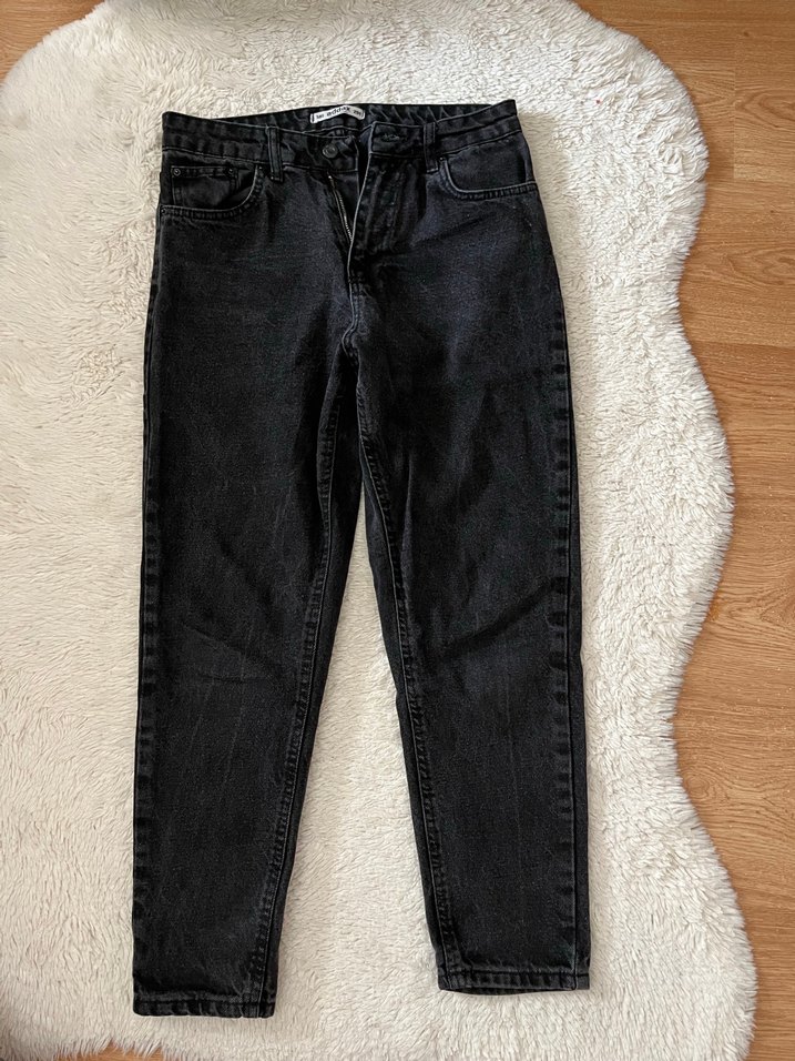 Siyah midi boy, regular fit denim jean, gündelik kullanım için rahat ve şık bir sokak stili sunar.
