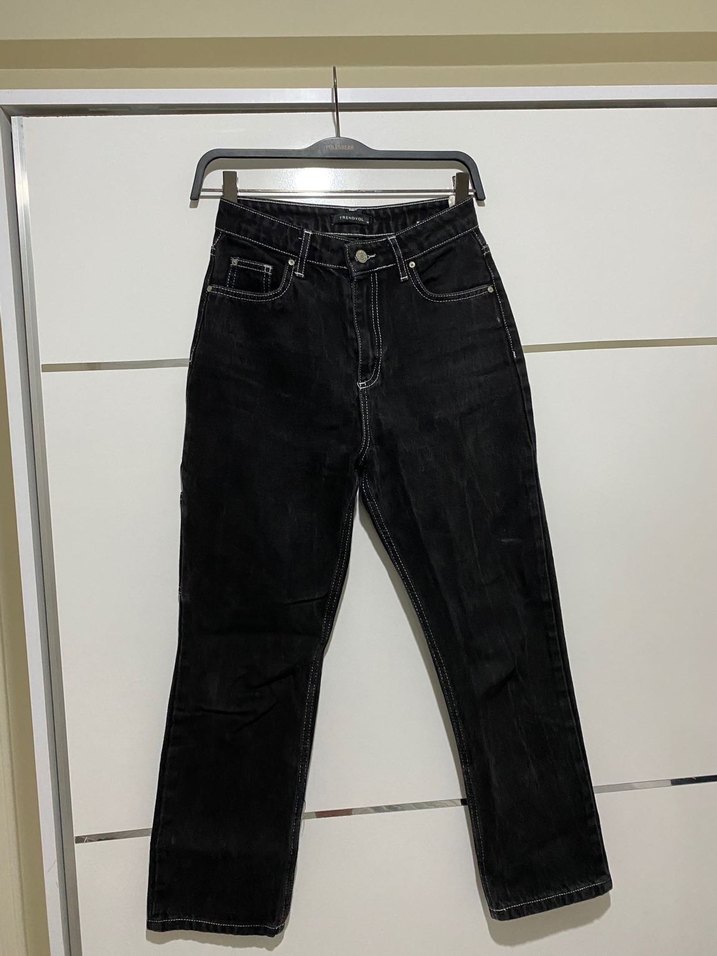 Siyah, midi boy, regular fit denim pantolon. Desensiz ve sokak stiline uygun, günlük kullanıma rahat ve şık bir seçim.