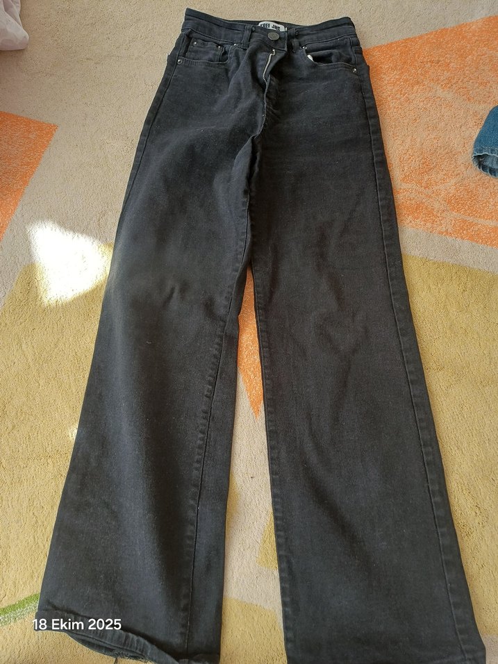 Siyah midi boy, regular fit, tokalı detaylı denim pantolon. Günlük sokak stili için uygun, desensiz tasarım.