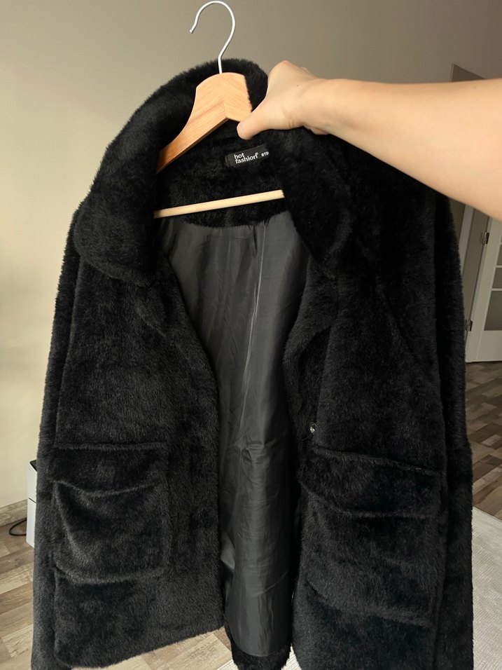 Siyah midi boy, yumuşak fleece kumaştan, kürk detaylı, notched yakalı ve uzun kollu, rahat kesim kadın mont. Günlük kullanım için uygun, trend sokak stili. 2 3 defa giyildi hiçbir deformesi yok . STANDAR BEDEN