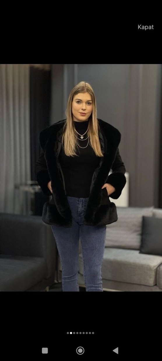Siyah midi boy, kürk detaylı, tam beden kesim kadın mont. Yumuşak ve sıcak kumaştan, uzun kollu, yüksek yakalı, günlük kullanım için uygun.