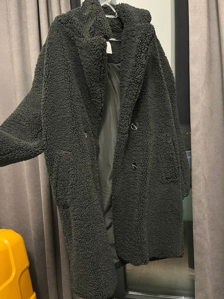 Siyah midi boy, kürklü detaylı kaban. Yumuşak ve sıcak kumaştan, geniş kesim, uzun kollu, sade desensiz tasarım.