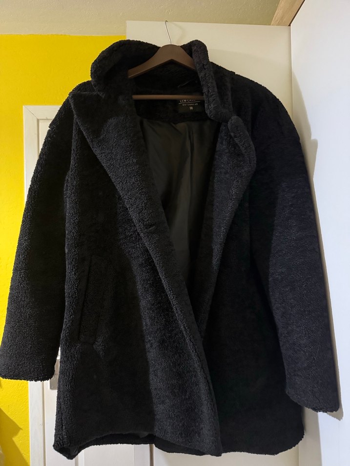 Siyah midi boy kaban, uzun kollu ve kürklü detaylıdır. Yumuşak ve sıcak dokusuyla rahat, bol kesim normcore tarzda günlük kullanım için uygundur.