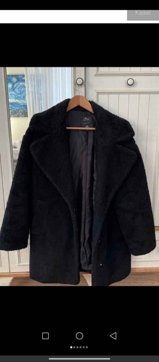 Siyah midi boy, bol kesim kadın kaban, yumuşak ve sıcak kumaştan, kürk detaylı, yakası kesik ve uzun kolludur. Rahat sokak stili için uygundur.