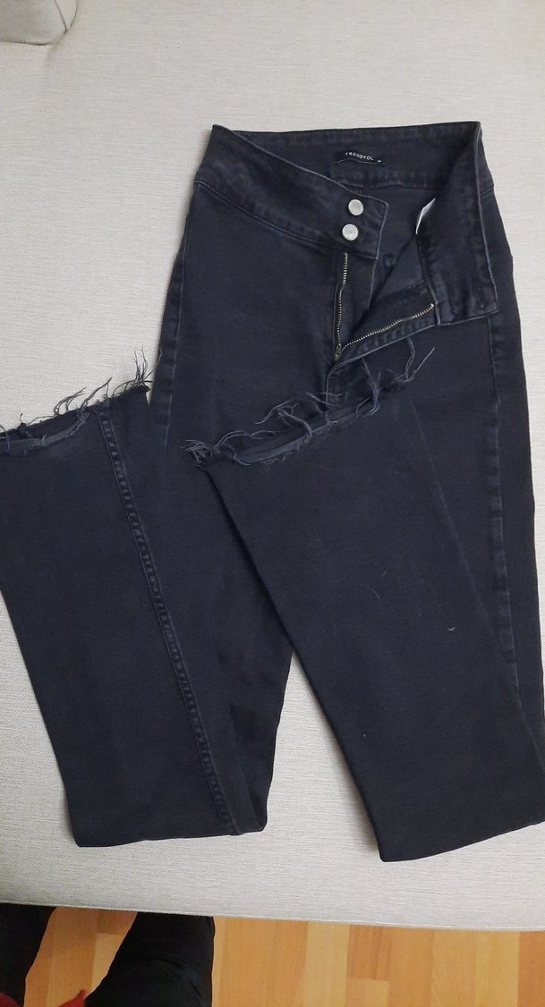 Siyah midi boy, regular fit kot pantolon, salaş kesim ve yıpranmış paça detaylarıyla sokak stiline uygun, günlük kullanıma ideal. Rahat ve şık görünüme sahiptir.