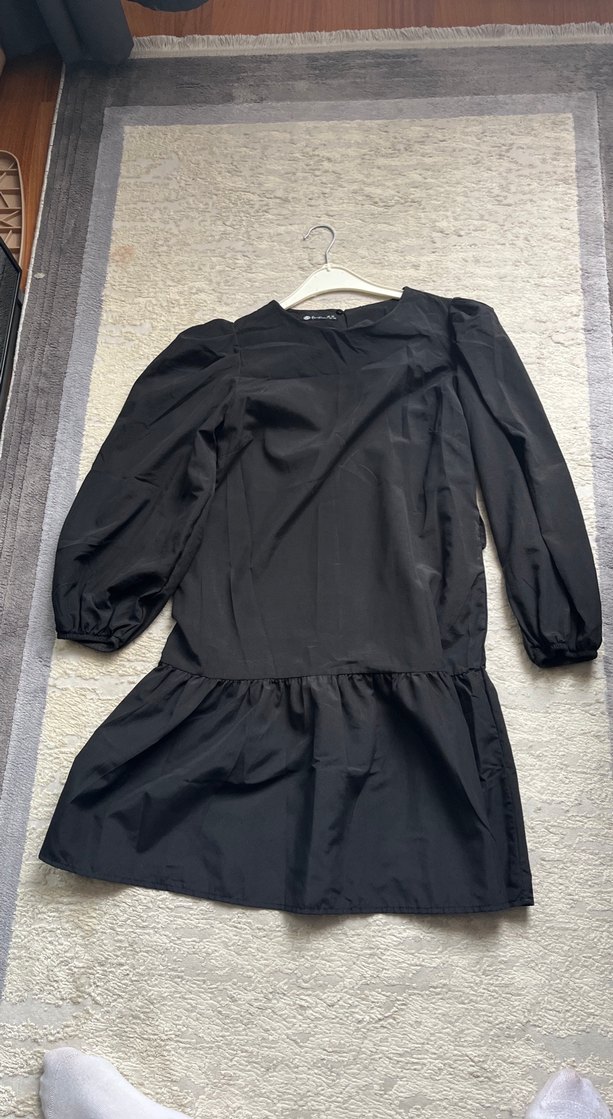 Siyah midi boy, uzun kollu, salaş kesim elbise. Drapeli detaylı, yuvarlak yakalı, günlük kullanıma uygun yumuşak sentetik kumaştan.