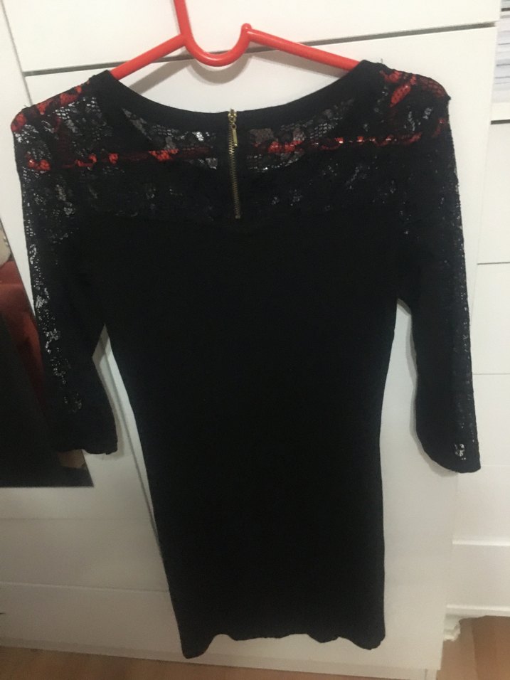 Siyah, v yaka, uzun kollu dantel detaylı gotik tarzda, midi boy, vücuda oturan elbise.