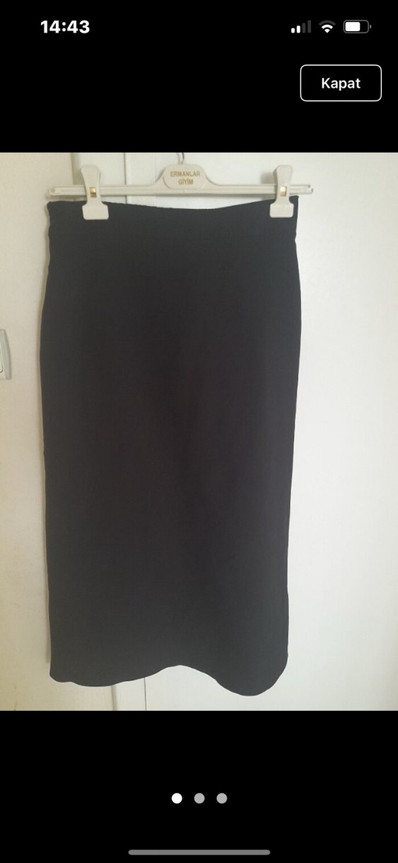 Düz siyah, dar kesim midi etek, yumuşak sentetik kumaştan üretilmiştir. Minimalist ve desen içermeyen tasarımıyla ofis için uygundur.