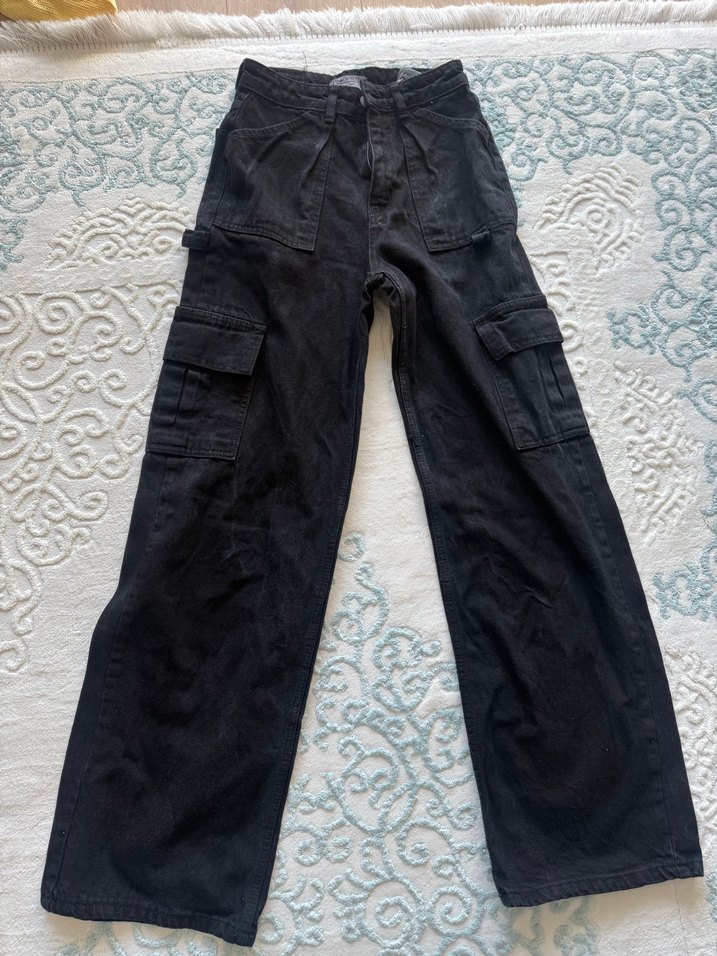 Siyah Midi Denim Bol Kesim Kargo Pantolon