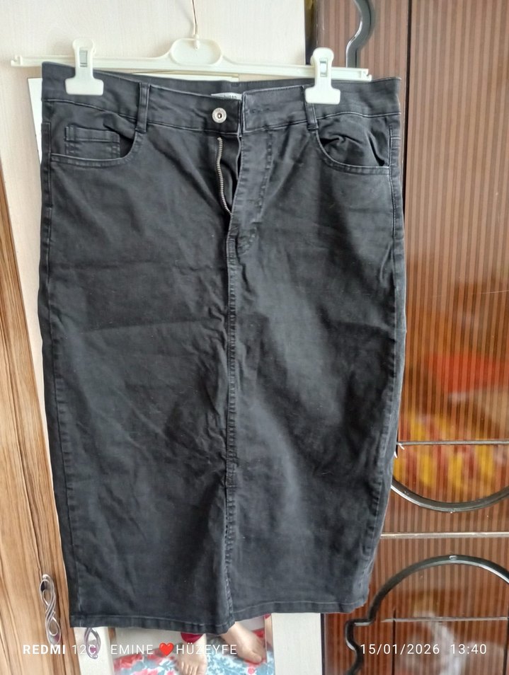 Siyah midi uzunlukta, denim etek Günlük kullanıma uygun, normcore tarzda ve desensiz.