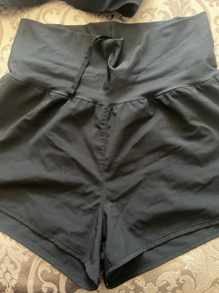 Siyah midi boy, bol kesim deniz şortu, esnek bel bandıyla rahatlık sağlar. Pürüzsüz sentetik kumaştan, günlük sokak stili için uygundur.