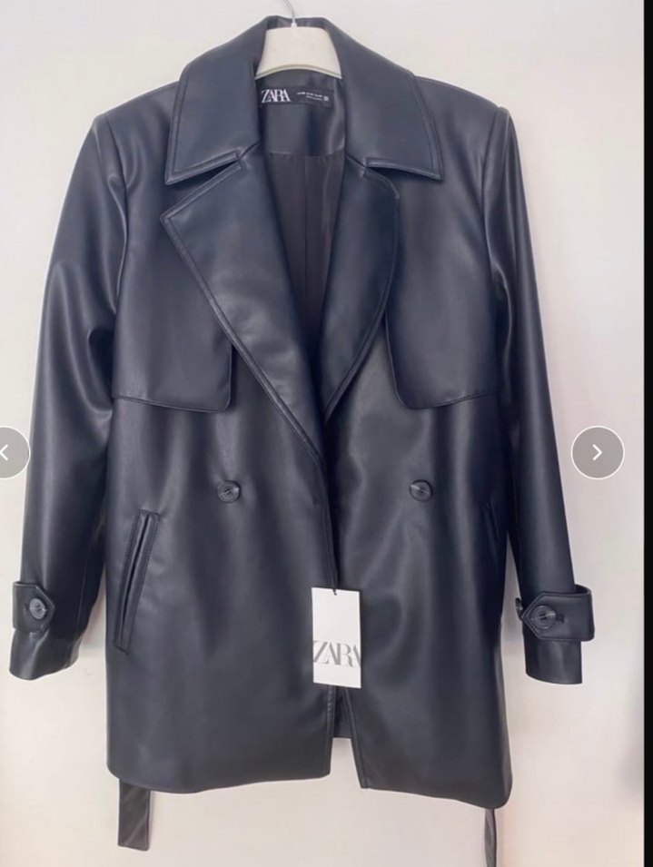 Siyah deri, düğmeli, normal kesim midi boy, yakalı ve askılı kollu kadın ceket. Ofis ve sokak modasına uygun. S m beden