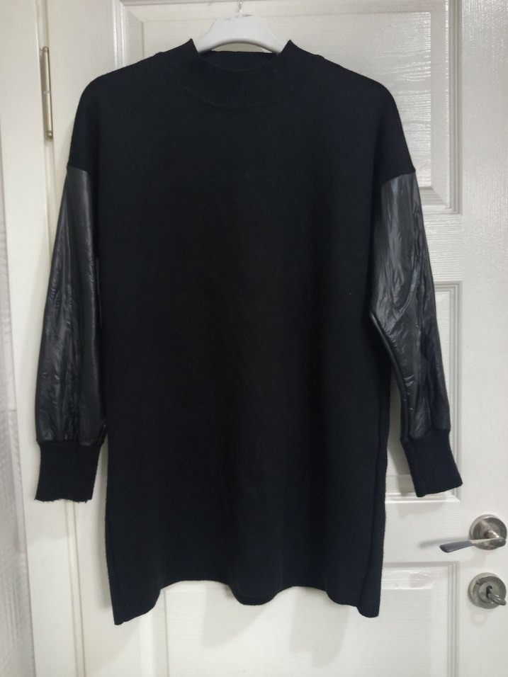 Siyah midi boy, deri kollu kadın triko, uzun kollu ve yuvarlak yakalıdır. Rahat kesimi ve konforlu dokusuyla günlük kullanıma uygundur.