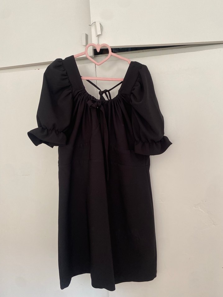 Siyah midi uzunlukta, bol kesim, drapeli ve askılı kollu goth tarzda elbise. Kayık yaka detaylı, günlük kullanıma uygun.