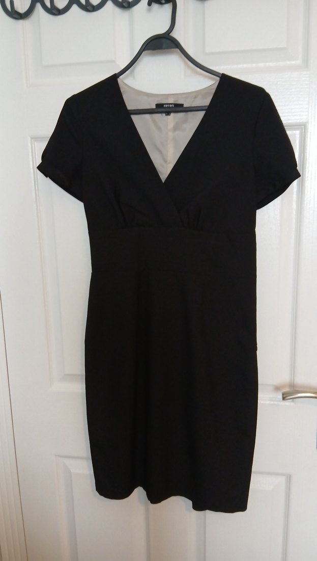 V yaka ve kısa kollu, drapeli tasarıma sahip, ipeksi kumaştan yapılmış siyah midi uzunlukta dar kesim elbise Ofis ve iş ortamları için uygun. yandan fermuarlı