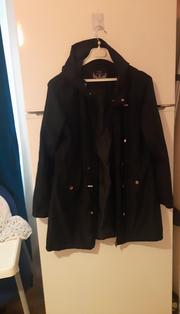 Siyah midi uzunlukta, düğmeli ve kesik yakalı kadın rüzgarlık. Bol kesim, uzun kollu ve yumuşak, sıcak tutan kumaştan üretilmiştir. Günlük sokak stili için uygundur.