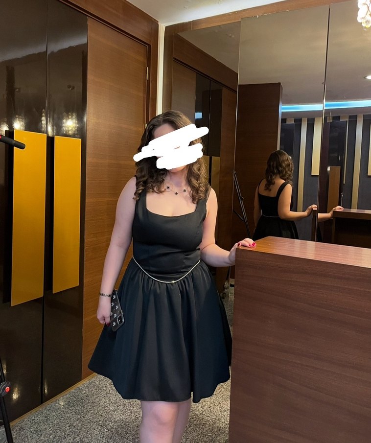 Siyah ve kabarık askılı, vücuda oturan midi elbise. Desensiz, ve düğün ve parti tarzı için uygun. 2 kere giyildi temiz defo yok.