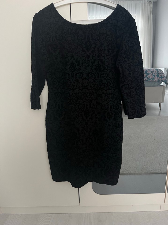 Kadife desenli uzun kollu sırt detaylı ve vücuda oturan siyah midi elbise, ofis için uygun klasik ve gotik tarzda şık bir seçenek.