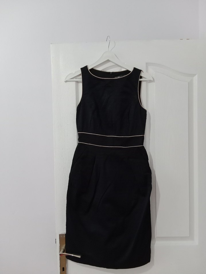 Kolsuz, yüksek yakalı, siyah midi elbise, modern klasik ve ofis tarzı için ideal.