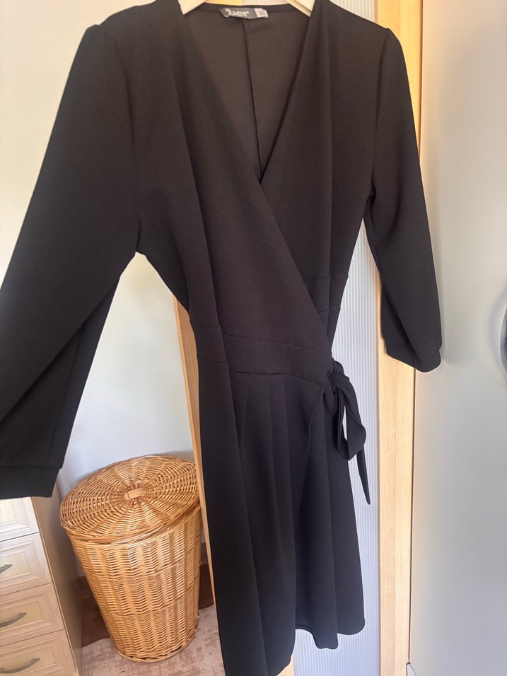 Siyah, diz boyu elbise, yaka detaylı ve dirsek kollu olup, belden bağlamalıdır.