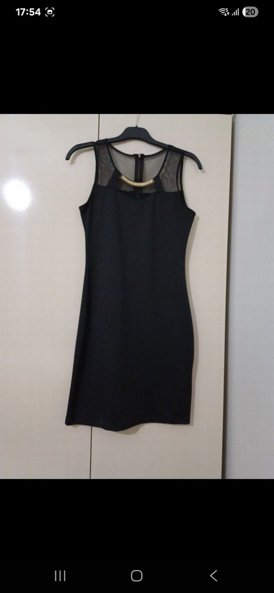 Kolsuz, vücuda oturan siyah midi elbise, yuvarlak yaka ve zincir detaylı şeffaf üst kısmıyla minimalist gotik tarzı yansıtır.