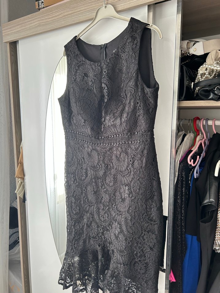 Siyah,dantel desenli ve sırtında fermuarlı, hafif dar kesim midi elbise 44 + bedenlere uygun ben giydiğimde 44 bedendim dar kalıp