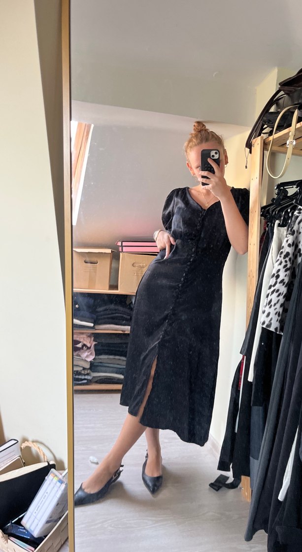 V yaka, düğmeli siyah midi elbise. İnce askılı kollu ve normal kesim, romantik akşamlar için uygun.