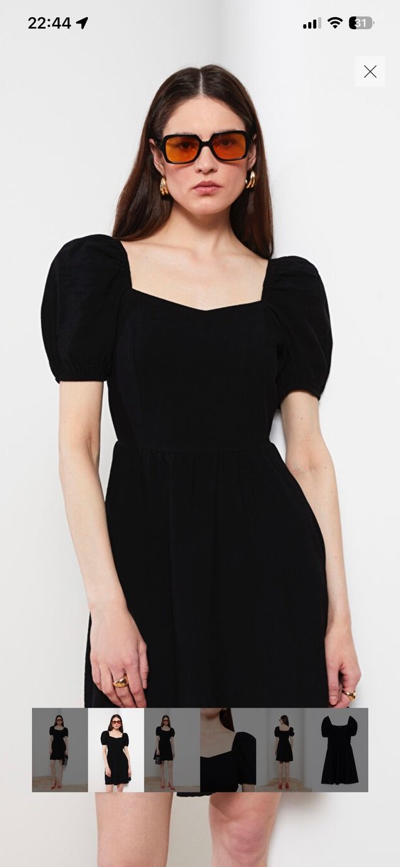 Siyah , V yakalı ve kısa kabarık kollu, vücuda oturan midi elbise. Cesur ve zahmetsiz şıklık sunar, romantik akşamlar için uygundur.