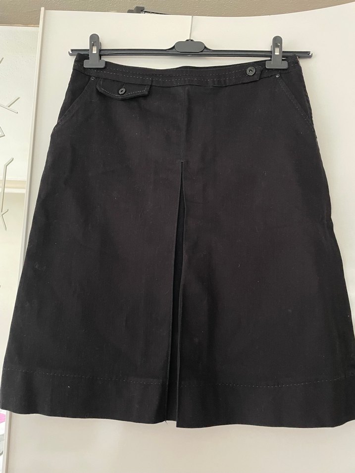 Siyah midi eteği, düzenli kesim ve pile detaylarıyla, yumuşak sentetik kumaştan üretilmiştir. Ofis ortamı için uygun, gotik iş tarzında.