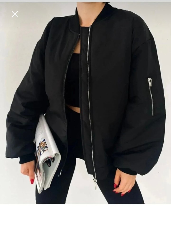 Siyah midi uzunlukta, bol kesim, uzun kollu ve bisiklet yaka kadın ceketi. Ön ve kol kısmında fermuar detayları bulunur, sentetik kumaştan üretilmiştir.