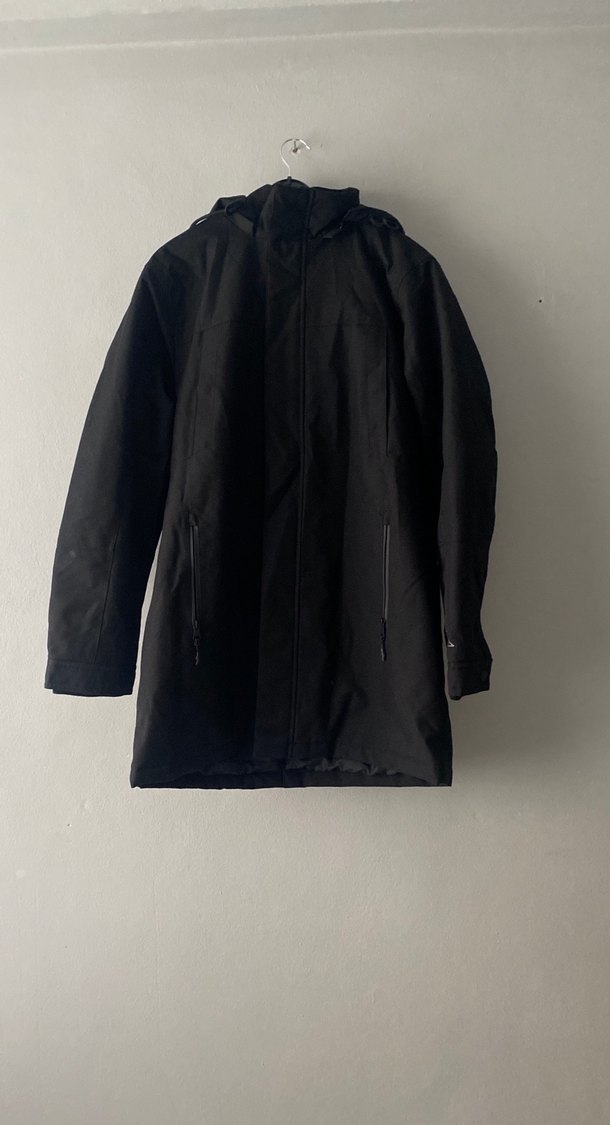 Siyah midi uzunluğunda çıtçıtlı yaka ve uzun kolludur. Fermuarlı cepleri ve ön fermuarı vardır, yumuşak ve sıcak kumaştan yapılmıştır.