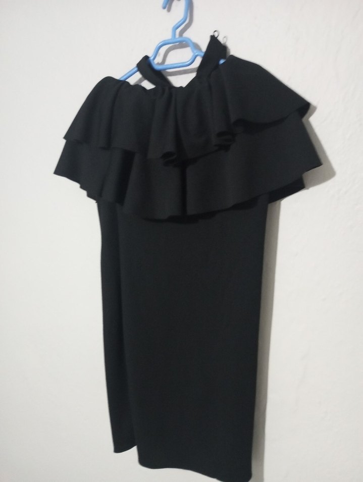 Siyah midi boy fırfırlı elbise. herhangi bir defosu yoktur. s bedendir. omuzları açık boyundan önden arkaya doğru bağlamalıdır.