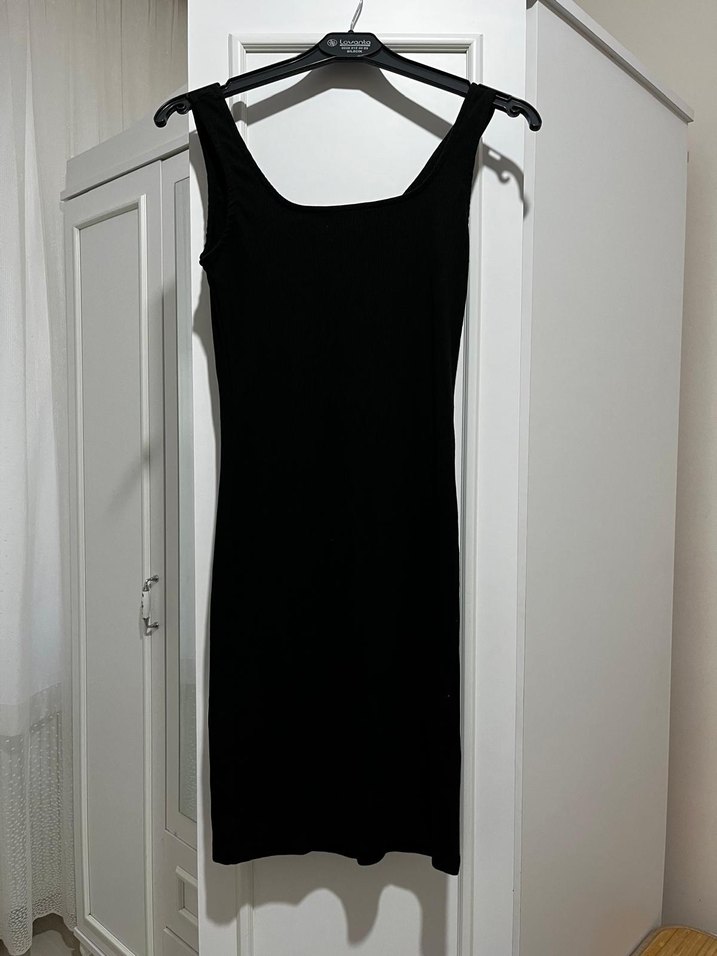 Bu siyah midi elbise, kolsuz ve tek düze yapısıyla fit bir siluete sahiptir. Sentetik kumaştan yapılmış olup, günlük kullanıma uygun zahmetsiz şıklık sunar. Minimalist ve gotik tarzlar için idealdir.