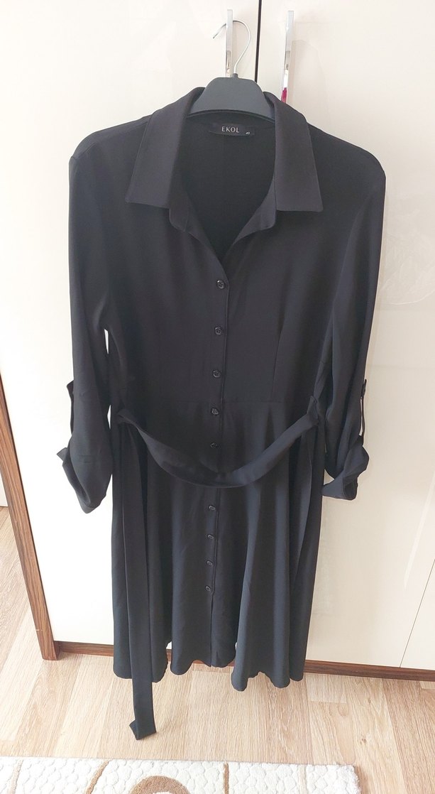 Siyah midi gömlek elbise, yakalı ve uzun kollu. Kemerli, bol kesim ve ipeksi dokulu, ofis için uygun.