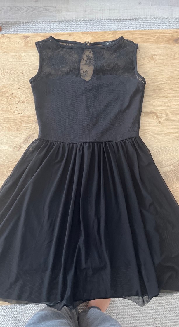 Siyah, dar kesim ve kolsuz abiye elbise, şeffaf dantel üst kısmı ve anahtar deliği detayına sahiptir. Romantik akşamlar için ideal, gotik tarzda midi boy elbise.
