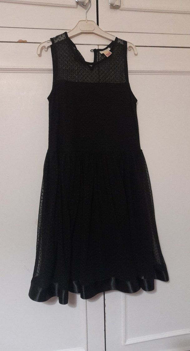 Kolsuz siyah midi elbise, V yakalı ve etek kısmında fırfır detaylı, fit kesimle romantik akşamlar için uygun.